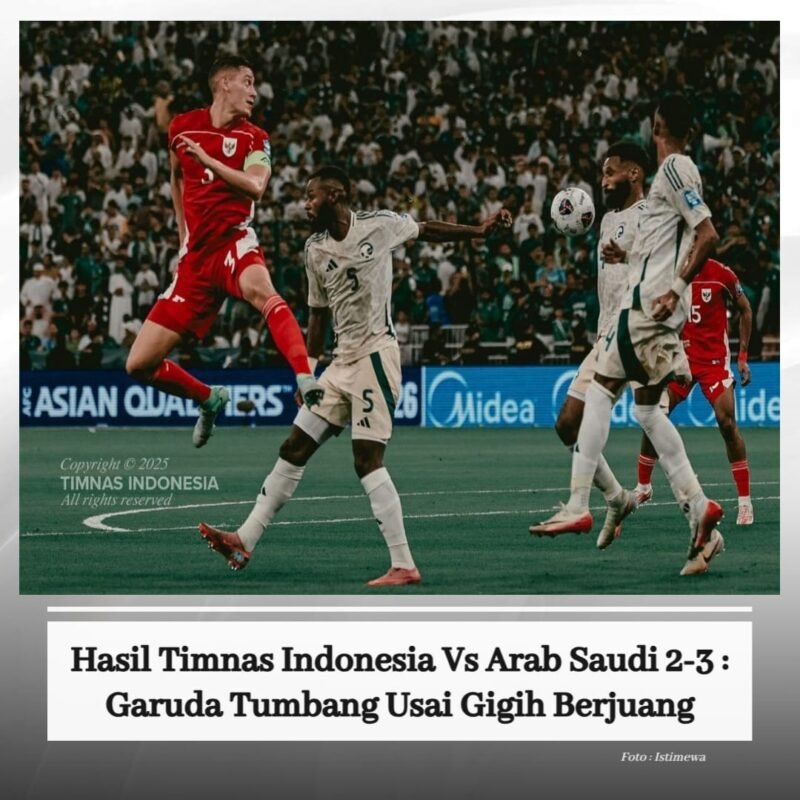 BIM | Hasil Timnas Indonesia vs Arab Saudi pada Kualifikasi Piala Dunia 2026 Zona Asia, Rabu (8/10/2025) waktu setempat atau Kamis (9/10/2025) dengan skor 2-3.