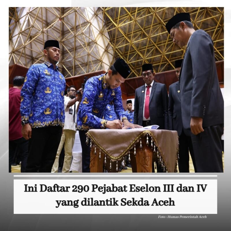 BIM | BANDA ACEH – Sekretaris Daerah Aceh, Muhammad Nasir, melantik 290 pejabat eselon III dan IV dalam lingkungan Pemerintah Aceh, di Anjong Mon Mata Komplek Meuligoe Gubernur Aceh, Jumat, (26/9/2025).