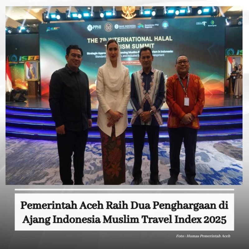 Berdasarkan hasil kajian IMTI 2025, Aceh terpilih sebagai salah satu dari lima besar provinsi terbaik di Indonesia dalam pengembangan destinasi pariwisata ramah muslim. Dua penghargaan yang diterima adalah Peringkat ke-4 Nasional untuk Kategori Destinasi Pariwisata Ramah Muslim dan Recognition for Leading the Path to Sharia Experiences, yang diberikan sebagai bentuk pengakuan atas komitmen Aceh dalam mengembangkan ekosistem wisata berbasis syariah secara berkelanjutan.
