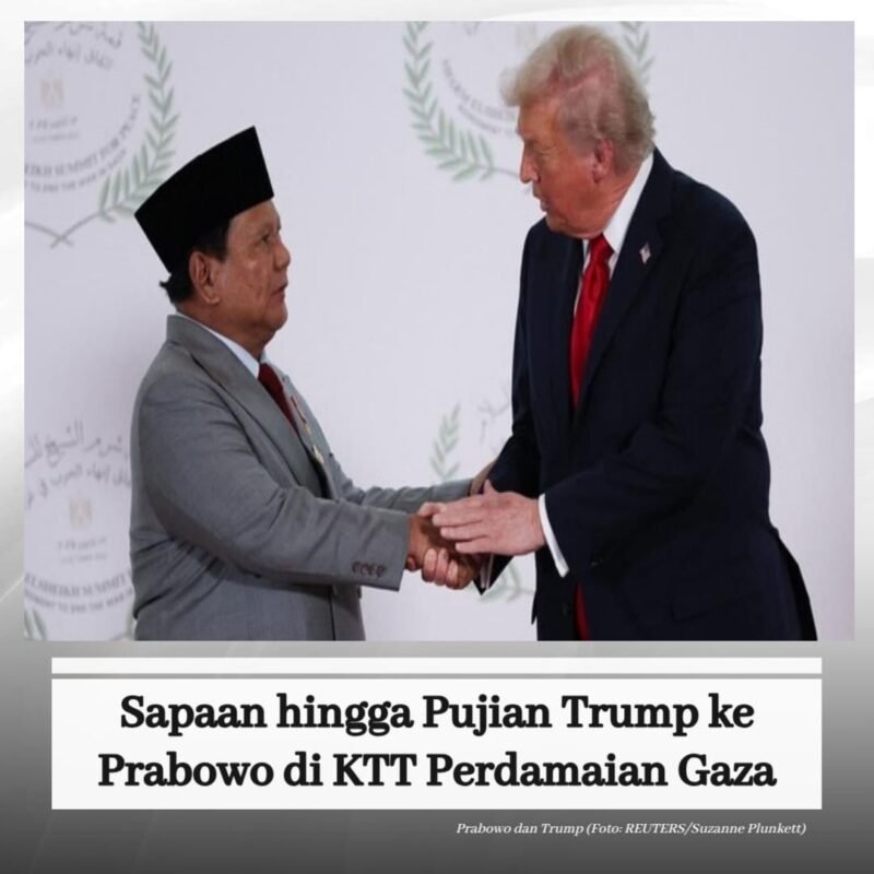 Tak hanya menyapa, selama memberikan pidato di KTT Perdamaian Gaza, Trump juga sempat memuji Presiden Prabowo. Kata Trump, Prabowo sosok luar biasa yang datang dari Indonesia.